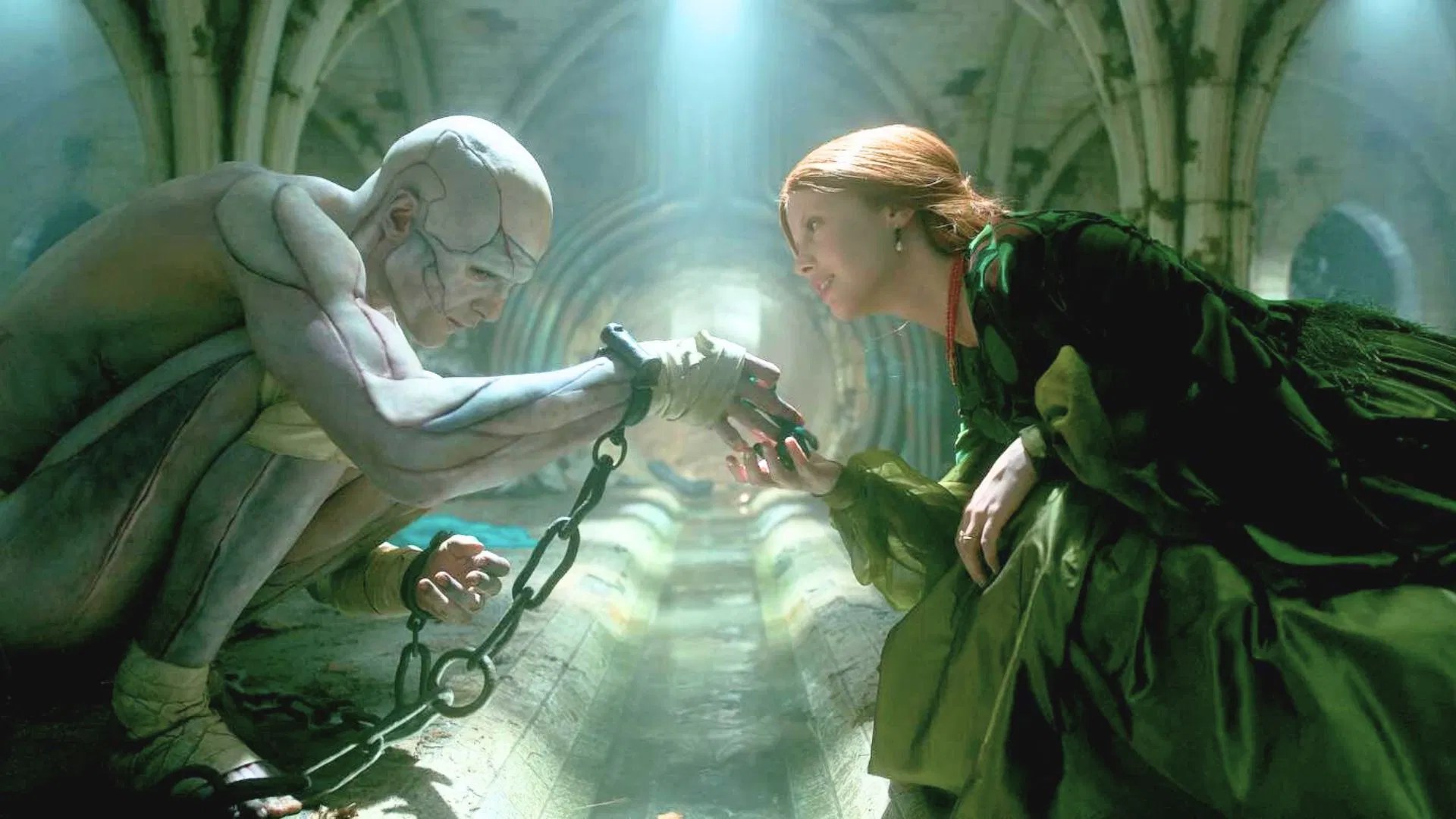 Del Toro’s film opens in the same way that the novel opens, a ship gets stranded in the Arctic and the crew pick up a badly injured Victor Frankenstein, who is being hunted across the frozen wasteland by his creation. Once free of the monster briefly, the movie conveys its narrative through Victor telling the ship captain his past but also allows the film to separate the film in half. Separated as chapter titles, the film begins as Victor’s recounting of events and then switches to the Monster’s own perspective. This matches the film’s character exploration and its use of the unreliable narrator, Victor is a troubled character across this film, the film very heavily handily says at a certain point that he is the true monster, and the film conveys this by showing the differences once it switches perspectives. Victor sees the world one way, and some relationships one way, but they are revealed to be figments of his imagination once you get the Monster’s more streamlined and simplistic perspective. Del Toro conveys the narrative as more of a gothic tragedy, for both the monster and Victor, as he picks up the sympathetic portrayals of the monster from the Universal features.